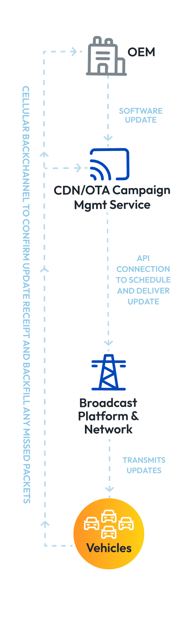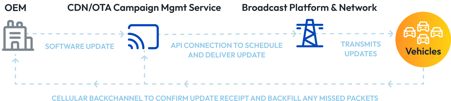 Cellular is the typical return path. While broadcast is leveraged for downlink, EdgeBeam uses application programming interfaces (APIs) so vehicles can send receipt acknowledgments and other data via cellular uplink. The use of APIs accommodates most existing OEM workflows.