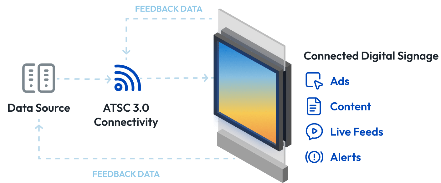 In the illustrated example, EdgeBeam’s custom solution for synchronized digital signage uses ATSC 3.0 connectivity for downlink distribution with cellular for uplink feedback.