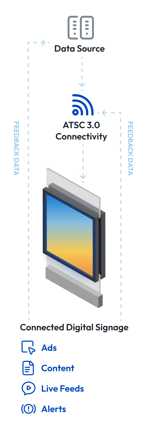 EdgeBeam delivers custom connectivity solutions for digital signage networks, combining ATSC 3.0 broadcast for scalable downlink distribution with cellular or broadband for uplink verification and control. This hybrid architecture enables synchronized content delivery at scale while improving efficiency and lowering network costs.